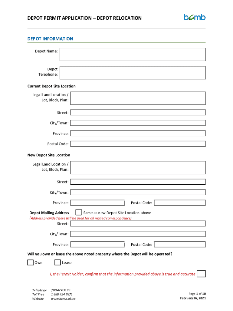 Depot relocation applicationbcmb is a form used to request the relocation of a depot.