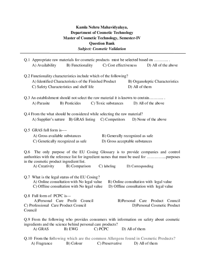 Kama Nehru Mahavidyalaya, Department of Cosmetic Technology Master of Cosmetic Technology, Semester IV Question Bank Subject: Cosmetic Validation Q.1 Appropriate raw materials for cosmetic products