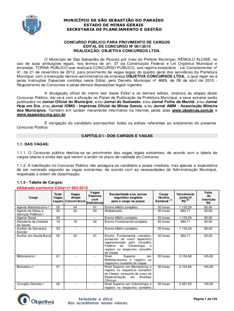 MUNICIPAL DE SO SEBASTIAN DO PARASOL ESTATE DE MINAS GERAIS SECRETARIAT DE PLANEJAMENTO E GESTOCONCURSO PBL ICO PARA PROVIDENT DE CARGOS EDIT AL DE CONCURS N 001/2015 REALIZED: OBJECTIVE CONCUR SOS