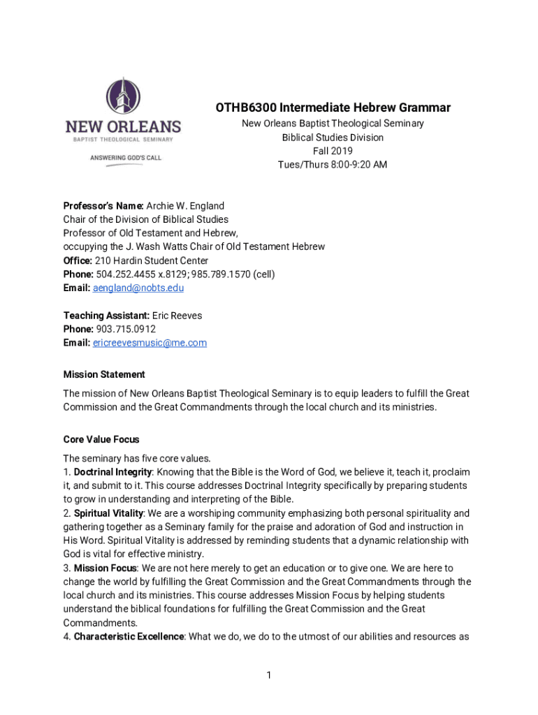 OTHB6300 Intermediate Hebrew Grammar New Orleans Baptist Theological Seminary Biblical Studies Division Fall 2019 Tues/Thurs 8:009:20 Professors Name: Archie W. England Chair of the Division of Biblical