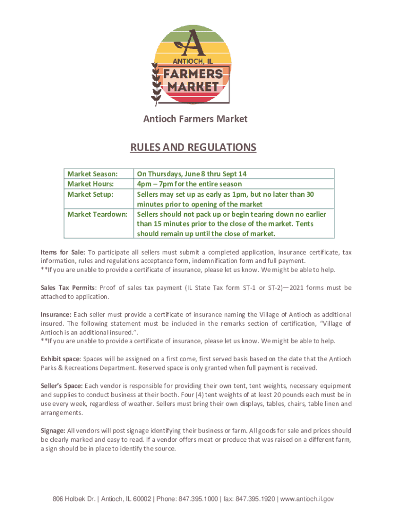 Antioch Farmers Marketable AND REGULATIONS Market Season: Market Hours: Market Setup: Market Teardown:On Thursdays, June 8 through Sept 14 4pm 7pm for the entire season Sellers may set up as early