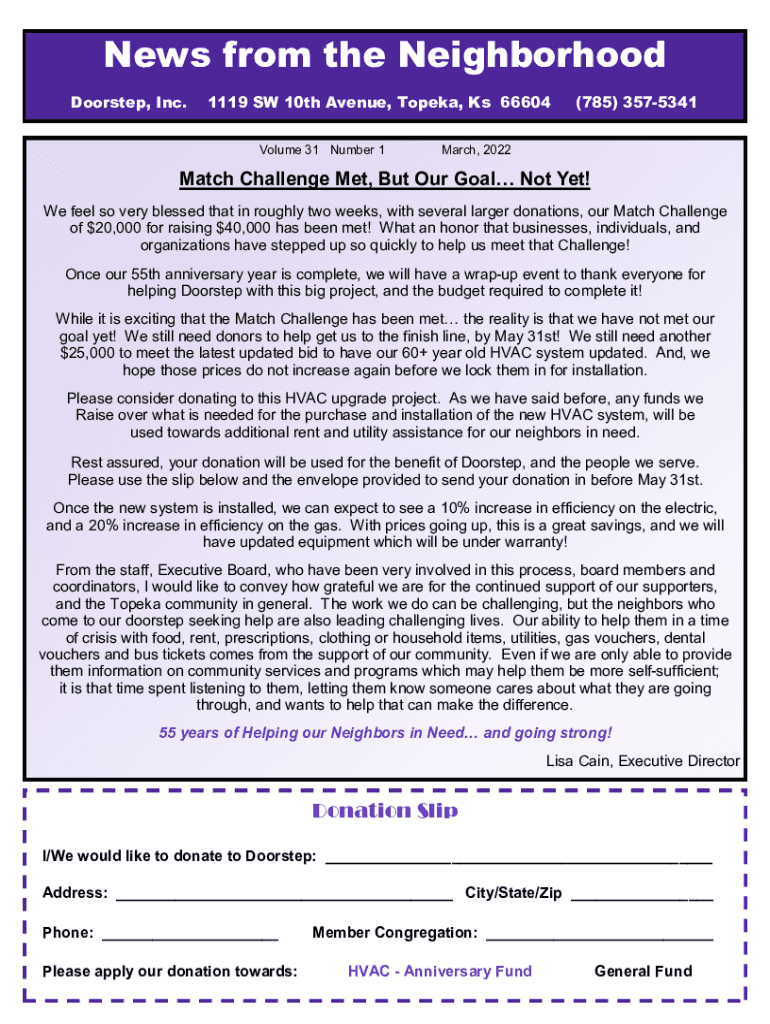 News from the Neighborhood Doorstep, Inc.1119 SW 10th Avenue, Topeka, Ks 66604 Volume 31 Number 1(785) 3575341March, 2022Match Challenge Met, But Our Goal Not Yet! We feel so very blessed that in