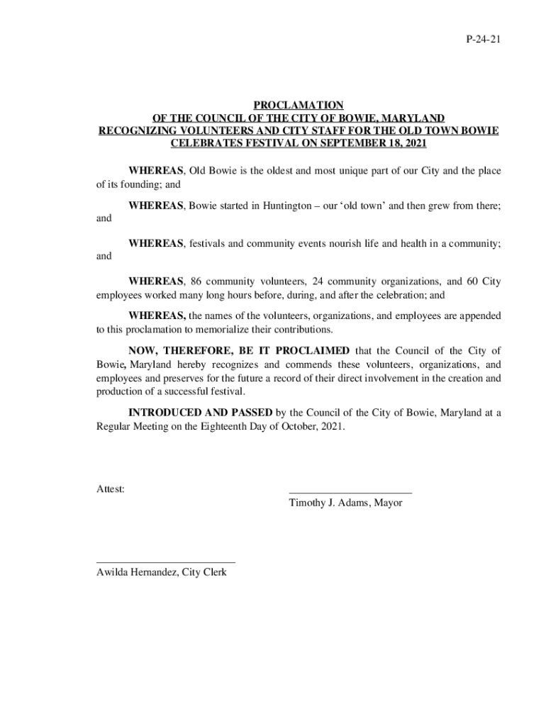 Get the free P-24-21 PROCLAMATION OF THE COUNCIL OF THE CITY OF ...