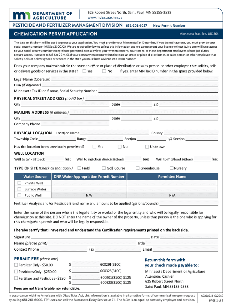 625 Robert Street North, Saint Paul, MN 551552538 www.mda.state.mn.usPESTICIDE AND FERTILIZER MANAGEMENT DIVISION 6512016057New Permit NumberCHEMIGATION PERMIT APPLICATION Minnesota Stat. Sec. 18C.205The