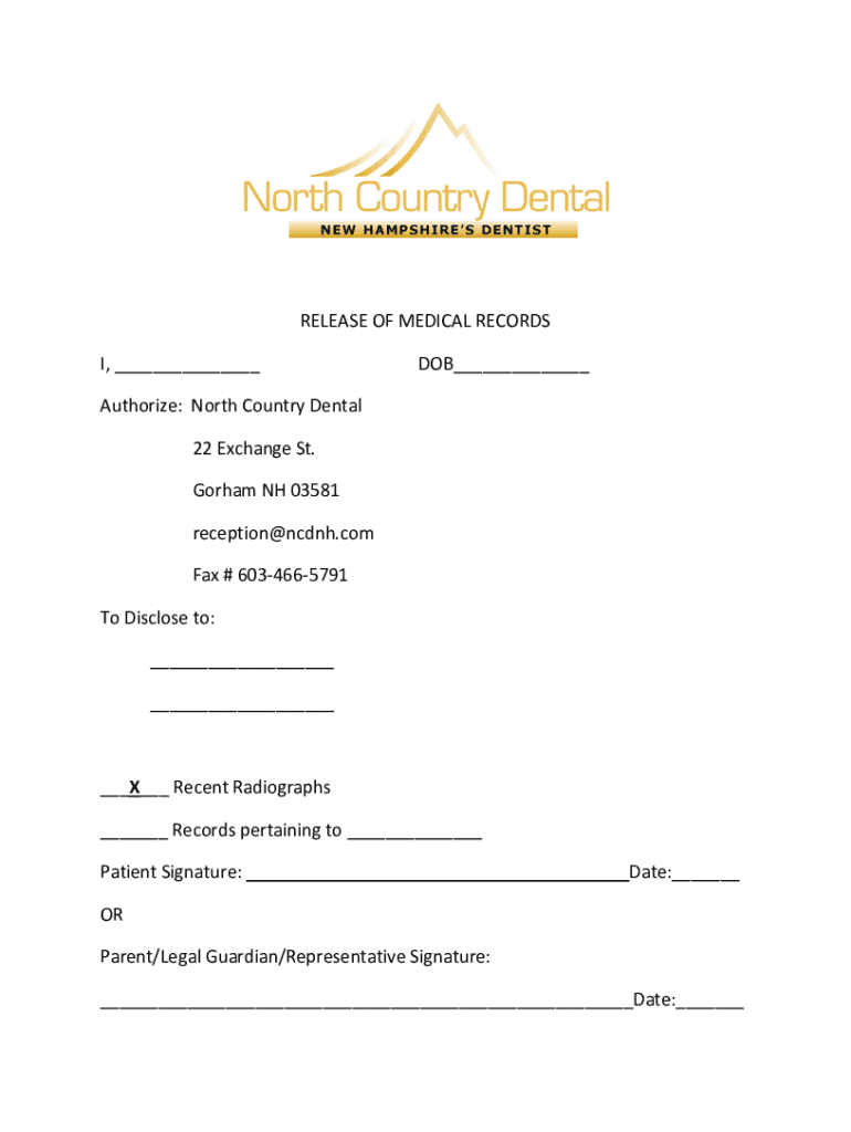 RELEASE OF MEDICAL RECORDS I, ___DOB___Authorize: North Country Dental 22 Exchange St. Gotham NH 03581 reception@ncdnh.com Fax # 6034665791 To Disclose to: ___ ______X___ Recent Radiographs ___ Records