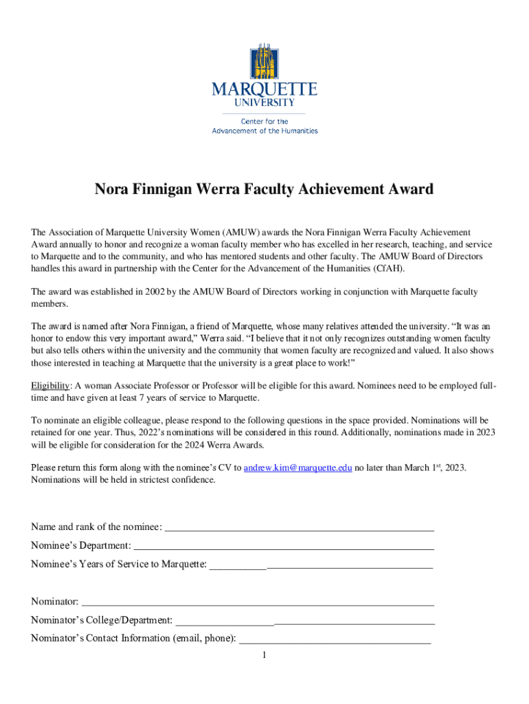Get the free Nominate a female faculty member for the 'Nora Finnigan ...