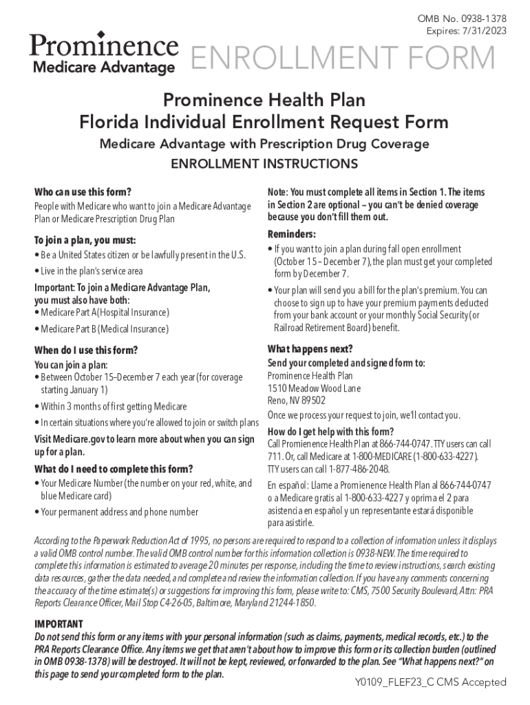 OMB No. 09381378 Expires: 7/31/2023ENROLLMENT FORM Prominence Health Plan Florida Individual Enrollment Request Form Medicare Advantage with Prescription Drug Coverage ENROLLMENT Instructions can