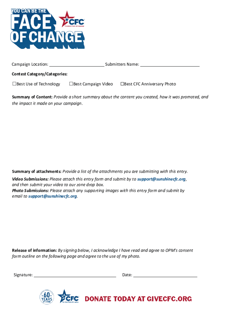 Campaign Location: ___ Submitters Name: ___ Contest Category/Categories: Best Use of Technology Best Campaign Video Best CFC Anniversary PhotoSummary of Content: Provide a short summary about the