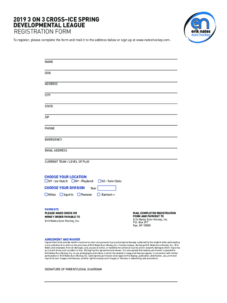 To register, please complete the form and mail it to the address below or sign up at www.nateshockey.com.NAMEDOB