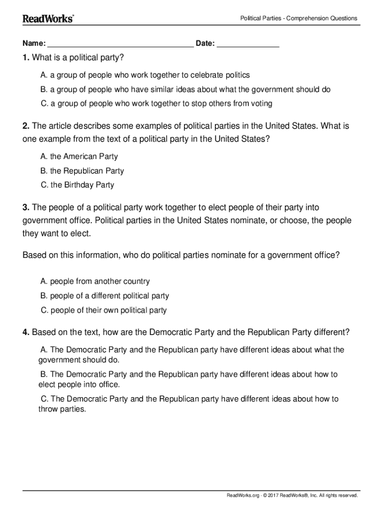 Political Parties Comprehension Questionnaire: ___ Date: ___1. What is a political party? A. a group of people who work together to celebrate politics B. a group of people who have similar ideas about