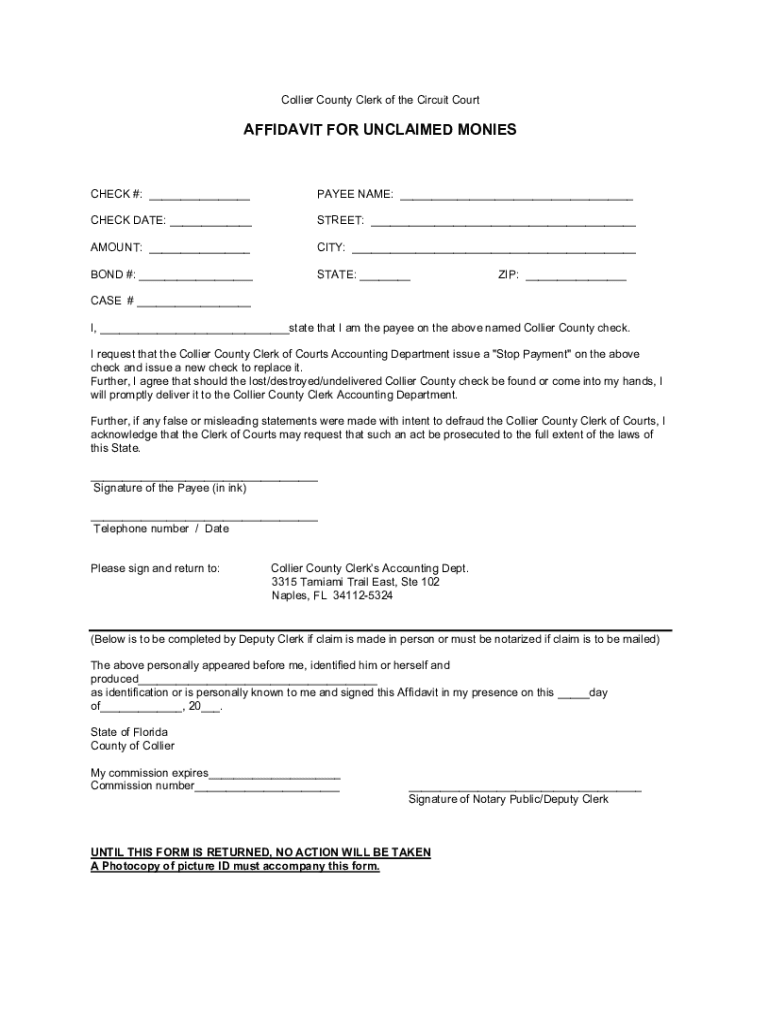 Collier County Clerk of the Circuit CourtAFFIDAVIT FOR UNCLAIMED MONIESCHECK #: ___PAYEE NAME: ___CHECK DATE: ___STREET: ___AMOUNT: ___CITY: ___BOND #: ___STATE: ___ZIP: ___CASE # ___