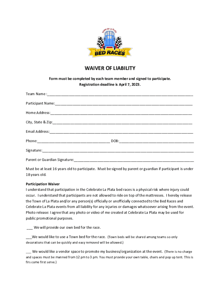 WAIVER OF LIABILITY Form must be completed by each team member and signed to participate. Registration deadline is April 7, 2023. Team Name :___ Participant Name:___ Home Address:___ City, State &