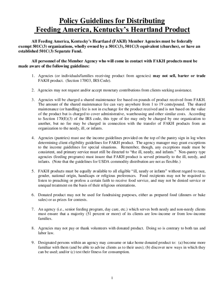 Policy Guidelines for Distributing Feeding America, Kentucky's Heartland Product All Feeding America, Kentucky's Heartland (FAKE) Member Agencies must be federally exempt 501C(3) organizations, wholly