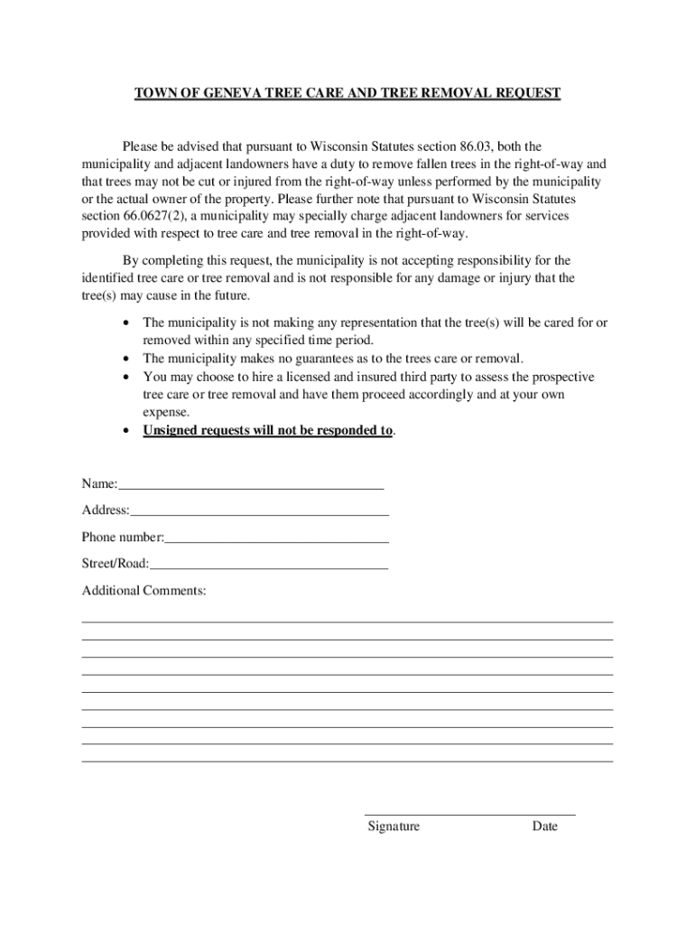 TOWN OF GENEVA TREE CARE AND TREE REMOVAL REQUESTPlease be advised that pursuant to Wisconsin Statutes section 86.03, both the