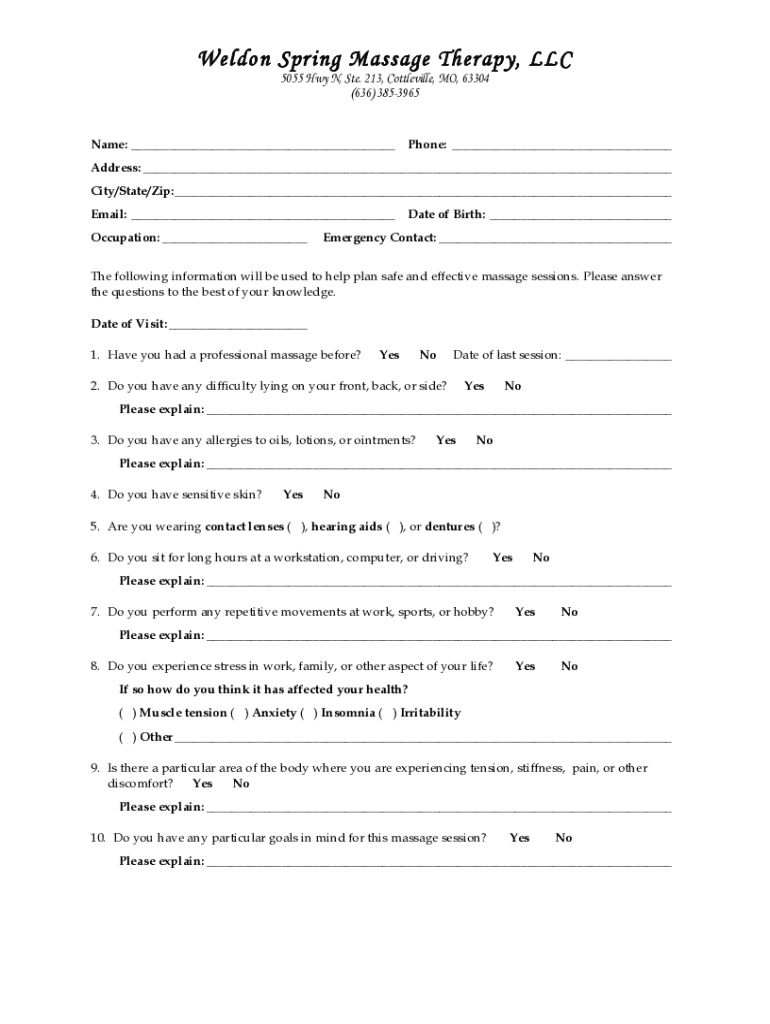 Weldon Spring Massage Therapy, LLC 5055 Hwy N, Ste. 213, Centreville, MO, 63304 (636) 3853965Name: ___Phone: ___Address: ___ City/State/Zip: ___ Email: ___ Occupation: ___Date of Birth: ___Emergency