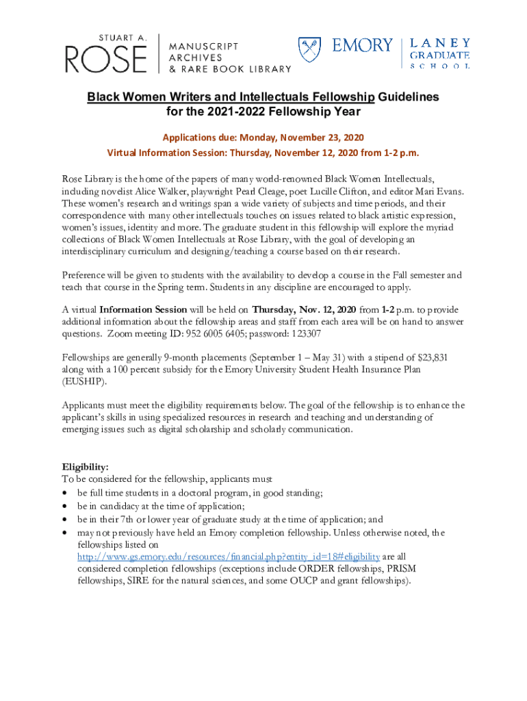 Black Women Writers and Intellectuals Fellowship Guidelines for the 20212022 Fellowship Year Applications due: Monday, November 23, 2020, Virtual Information Session: Thursday, November 12, 2020,