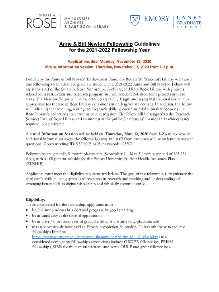 Anne & Bill Newton Fellowship Guidelines for the 20212022 Fellowship Year Applications due: Monday, November 23, 2020, Virtual Information Session: Thursday, November 12, 2020, from 12 p.m. Funded