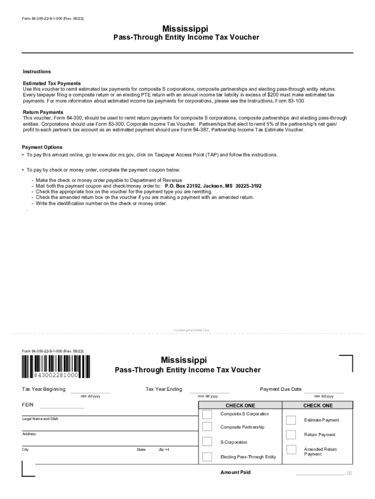 Form 843002281000 (Rev. 08/22)MississippiPassThrough Entity Income Tax VoucherInstructions Estimated Tax Payments Use this voucher to remit estimated tax payments for composite S corporations, composite