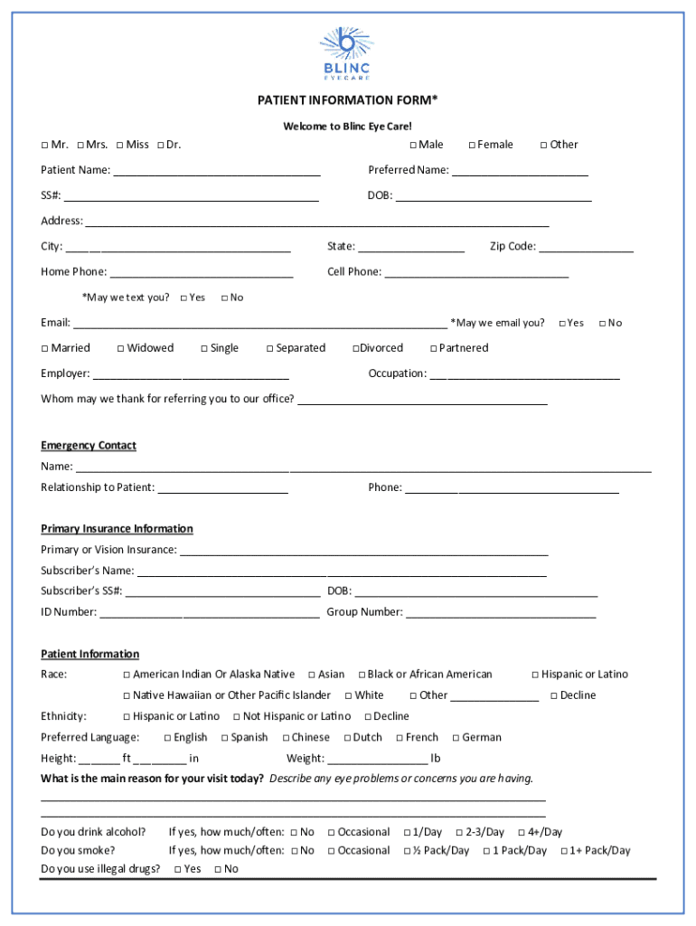 All new patients visiting Blinc medical facility are required to fill out and submit the new blinc patient intake form.