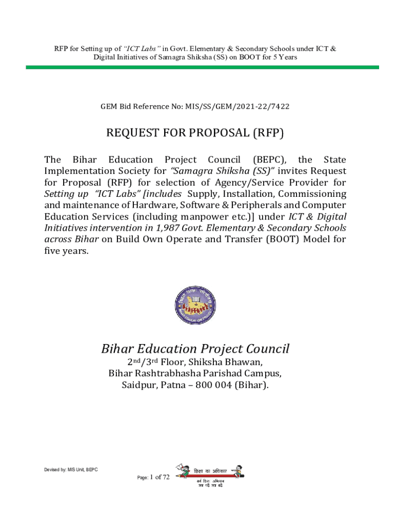RFP for Setting up of ICT Labs in Govt. Elementary & Secondary Schools under ICT & Digital Initiatives of Samara Shikhar (SS) on BOOT for 5 Years GEM Bid Reference No: MIS/SS/GEM/202122/7422REQUEST