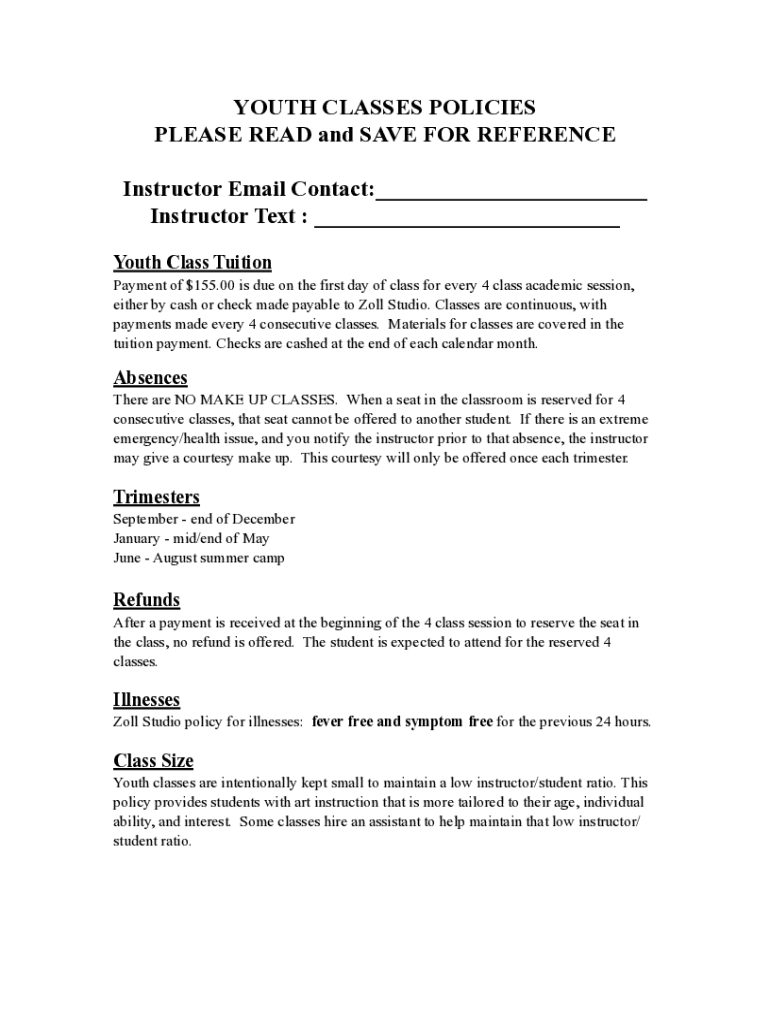 YOUTH CLASSES POLICIES PLEASE READ and SAVE FOR REFERENCE Instructor Email Contact:___ Instructor Text : ___ Youth Class Tuition Payment of $155.00 is due on the first day of class for every 4 class