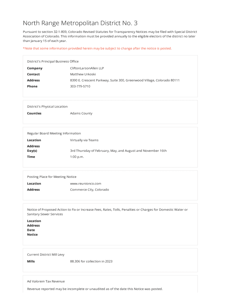North Range Metropolitan District No. 3 Pursuant to section 321809, Colorado Revised Statutes for Transparency Notices may be filed with Special District Association of Colorado. This information