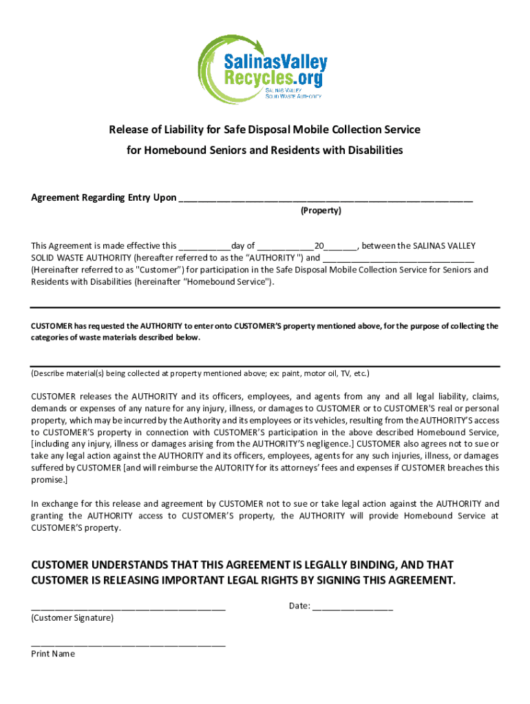 Get the free Release of Liability for Safe Disposal Mobile Collection ...