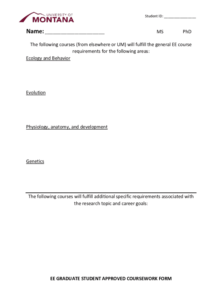 Student ID: ___Name: ___Spathe following courses (from elsewhere or UM) will fulfill the general EE course requirements for the following areas: Ecology and BehaviorEvolutionPhysiology, anatomy, and