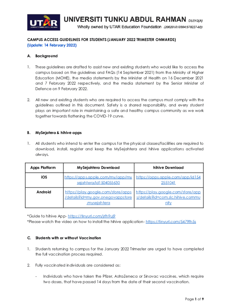 CAMPUS ACCESS GUIDELINES FOR STUDENTS (JANUARY 2022 TRIMESTER ONWARDS) (Update: 14 February 2022) A. Background1. These guidelines are drafted to assist new and existing students who would like to