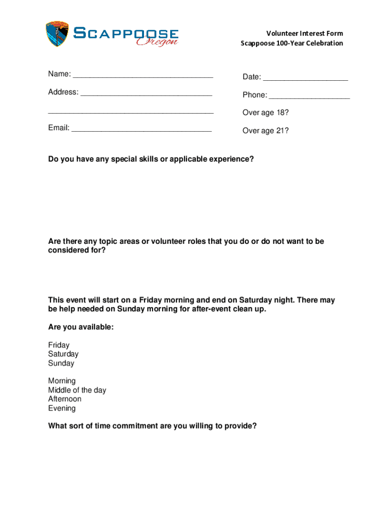 The volunteer interest form in Scappoose may require information such as name, contact details, availability, skills, and interests.