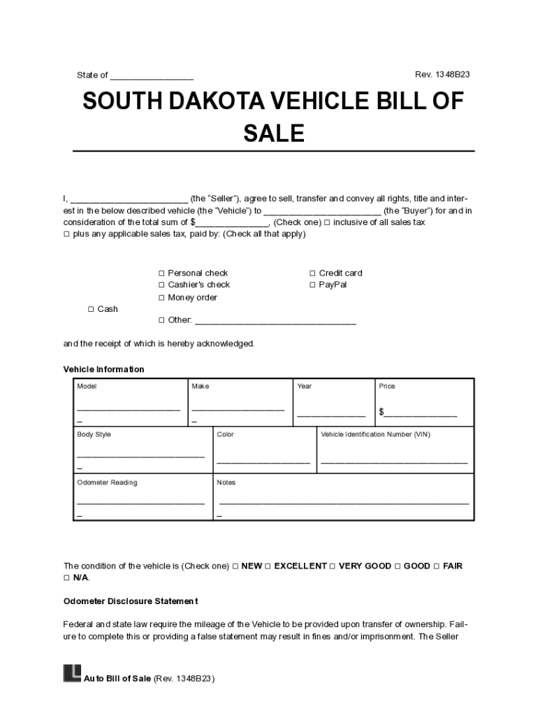 Rev. 1348B23State of ___SOUTH DAKOTA VEHICLE BILL OF SALE I, ___ (the Seller), agree to sell, transfer and convey all rights, title and interest in the below described vehicle (the Vehicle) to ___