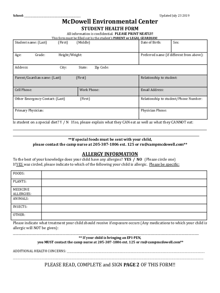School: ___Updated July 23 2019McDowell Environmental Center STUDENT HEALTH From All information is confidential. PLEASE PRINT NEATLY! This form must be filled out by the students PARENT or LEGAL