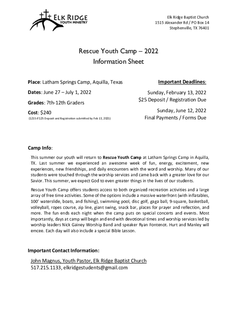 Elk Ridge Baptist Church 1515 Alexander Rd / PO Box 14 Steubenville, TX 76401Rescue Youth Camp 2022 Information Sheet Important Deadlines:Place: Latham Springs Camp, Aquila, Texas Dates: June 27 July