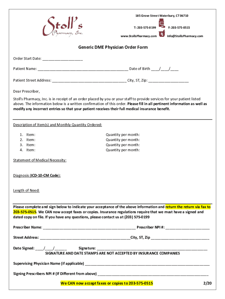 185 Grove Street Waterbury, CT 06710 T: 2035750199 www.StollsPharmacy.comF: 2035750515 Info@StollsPharmacy.comGeneric DME Physician Order Form Order Start Date: ___ Patient Name: ___ Date of Birth