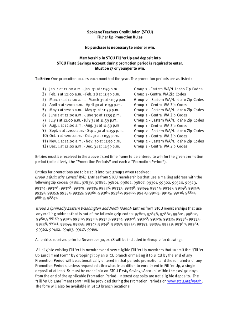 Spokane Teachers Credit Union (SCU) Fill her Up Promotion Rules No purchase is necessary to enter or win. Membership in SCU Fill her Up and deposit into SCU First5 Savings Account during promotion