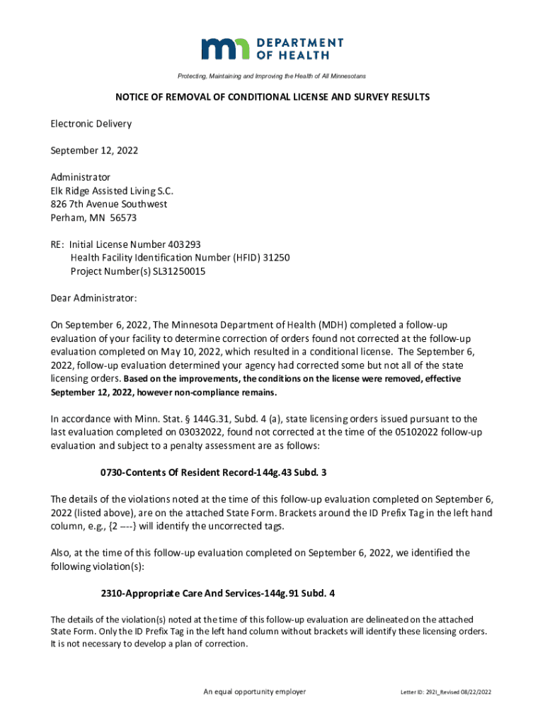 Protecting, Maintaining and Improving the Health of All MinnesotansNOTICEOFREMOVALOFCONDITIONALLICENSEANDSURVEYRESULTS