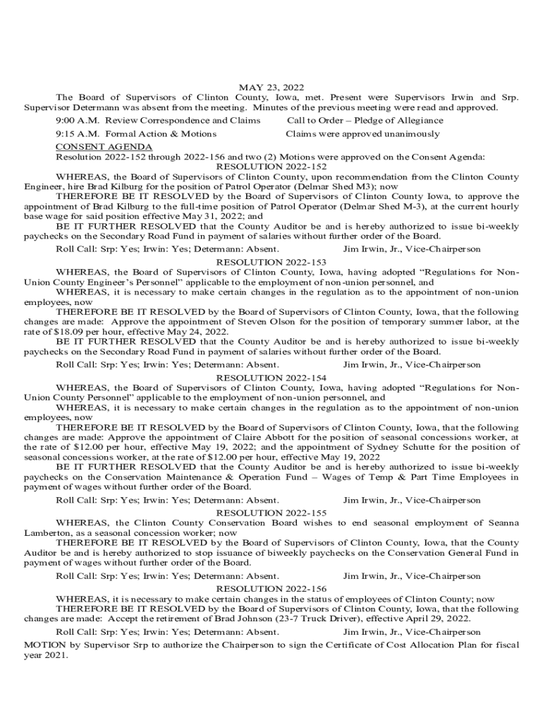 The Board of Supervisors of Clinton County, Iowa, met. Present were Supervisors Irwin and SRP.