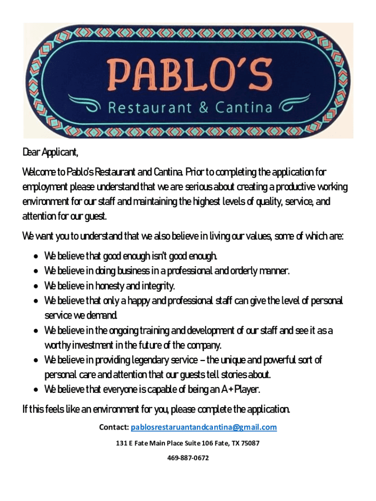 Dear Applicant, Welcome to Pablo's Restaurant and Canting. Prior to completing the application for employment please understand that we are serious about creating a productive working environment