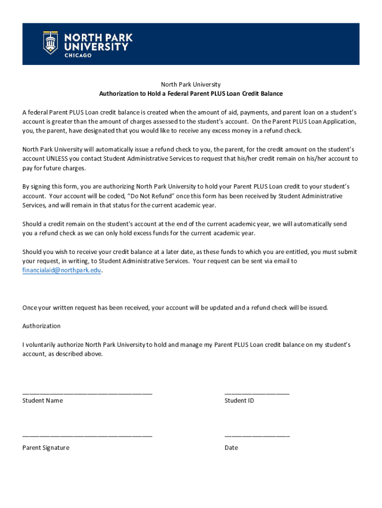 North Park University Authorization to Hold a Federal Parent PLUS Loan Credit Balance A federal Parent PLUS Loan credit balance is created when the amount of aid, payments, and parent loan on a student