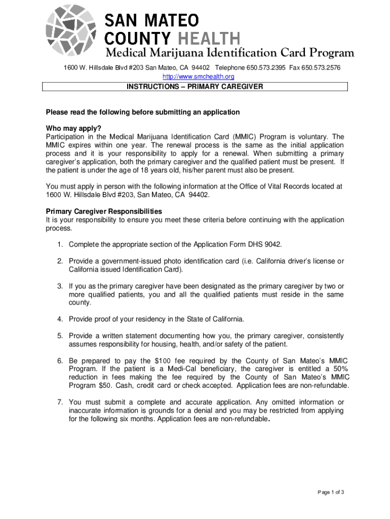 Medical Marijuana Identification Card Program 1600 W. Hillsdale Blvd #203 San Mateo, CA 94402 Telephone 650.573.2395 Fax 650.573.2576 http://www.smchealth.orgINSTRUCTIONS PRIMARY CAREGIVERPlease read