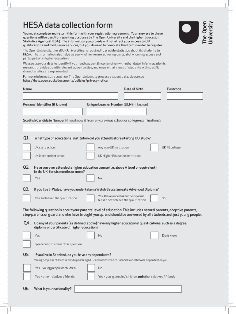 ESA data collection form You must complete and return this form with your registration agreement. Your answers to these questions will be used for reporting purposes by The Open University and the