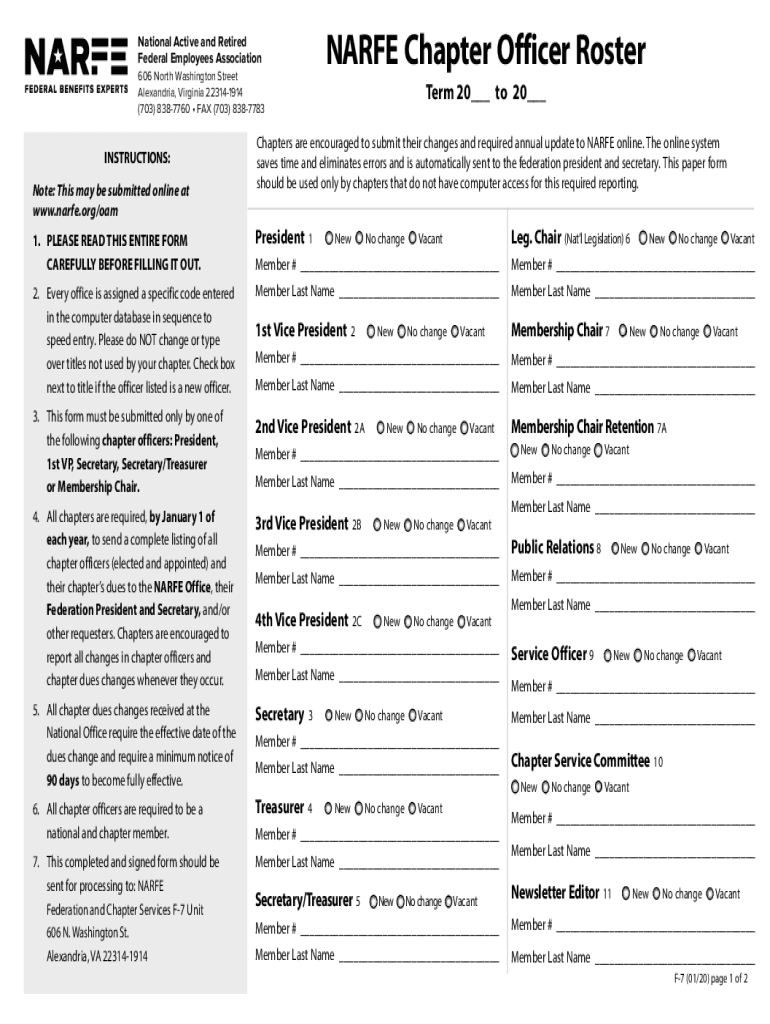 National Active and Retired Federal Employees AssociationNARFE Chapter Officer Roster606 North Washington Street Alexandria, Virginia 223141914 (703) 8387760 FAX (703) 8387783INSTRUCTIONS: Note: This