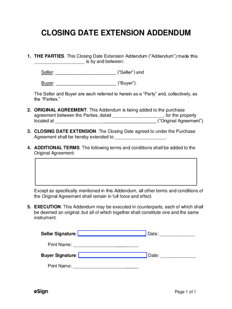 CLOSING DATE EXTENSION ADDENDUM 1. THE PARTIES. This Closing Date Extension Addendum (Addendum) made this ___ is by and between: Seller: ___ (Seller) and Buyer: ___ (Buyer). The Seller and Buyer are