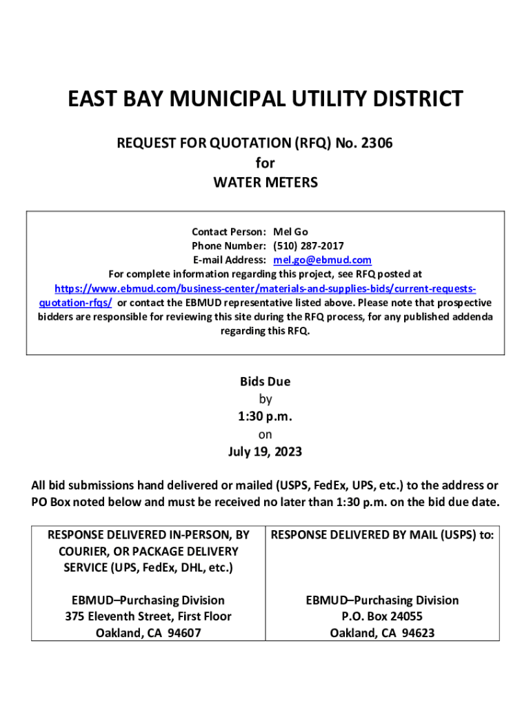 EAST BAY MUNICIPAL UTILITY DISTRICT REQUEST FOR QUOTATION (RFQ) No. 2306ure for WATER METERS Contact Person: Mel Go Phone Number: (510) 2872017 Email Address: mel.go@ebmud.com For complete information