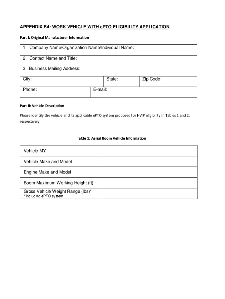 APPENDIX B4: WORK VEHICLE WITH PTO ELIGIBILITY APPLICATION Part I: Original Manufacturer Information1. Company Name/Organization Name/Individual Name: 2. Contact Name and Title: 3. Business Mailing