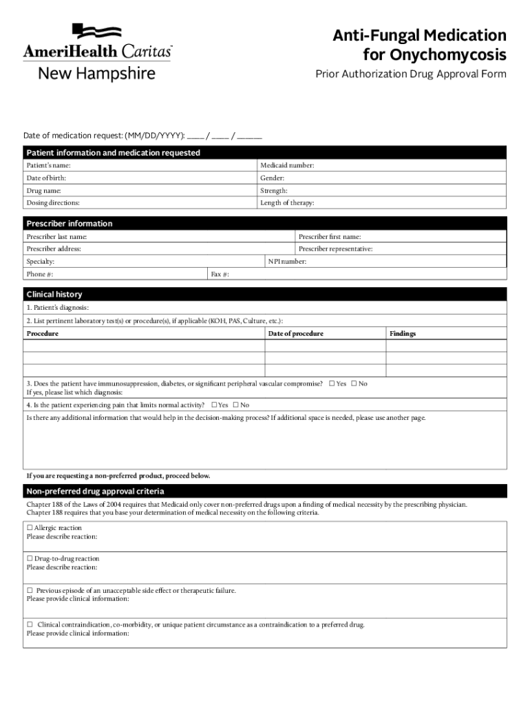AntiFungal Medication for Onychomycosis Prior Authorization Drug Approval Format of medication request: (MM/DD/YYY): ___ / ___ / ___ Patient information and medication requested Patients name:Medicaid