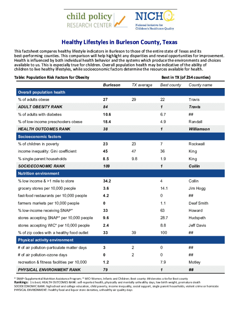 Healthy Lifestyles in Burleson County, Texas This fact sheet compares healthy lifestyle indicators in Burleson to those of the entire state of Texas and its best performing counties. This comparison