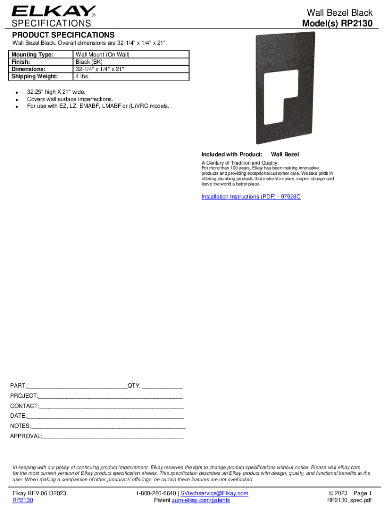 Wall Bezel Black Model(s) RP2130SPECIFICATIONS PRODUCT SPECIFICATIONS Wall Bezel Black. Overall dimensions are 321/4\” x 1/4\” x 21\”. Mounting Type: Finish: Dimensions: Shipping Weight: Wall