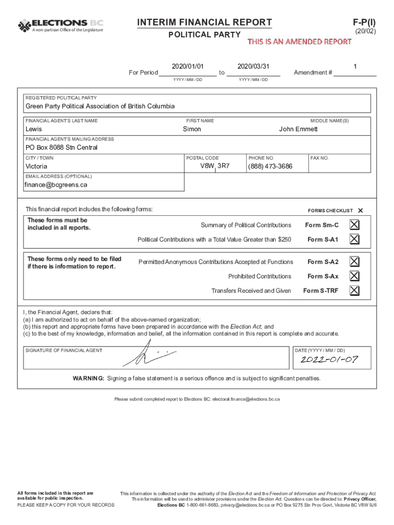 (20/02)POLITICAL Party Period2020/01/012020/03/31toYYYY / MM / DD1Amendment #YYY / MM / DEREGISTERED POLITICAL PARTY
