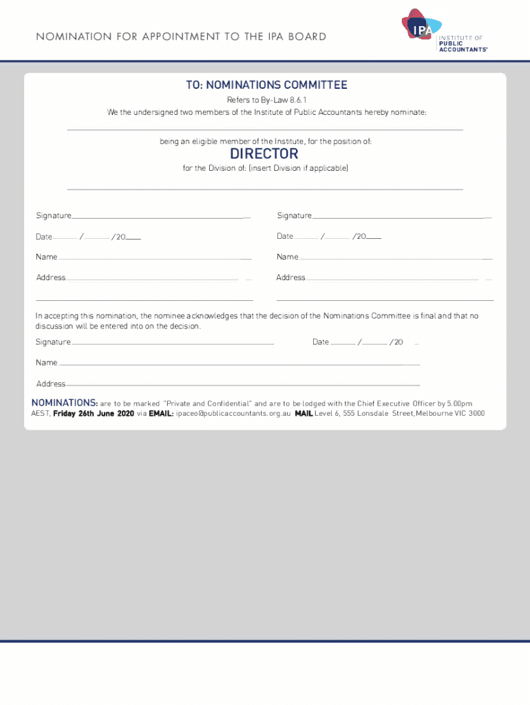 NOMINATION FOR APPOINTMENT TO THE IPA BOARDINSTITUTE OF I PUBLIC ACCOUNTANTS\” TO: NOMINATIONS COMMITTEE Refers to Bylaw 8.6.1 We the undersigned two members of the Institute of Public Accountants